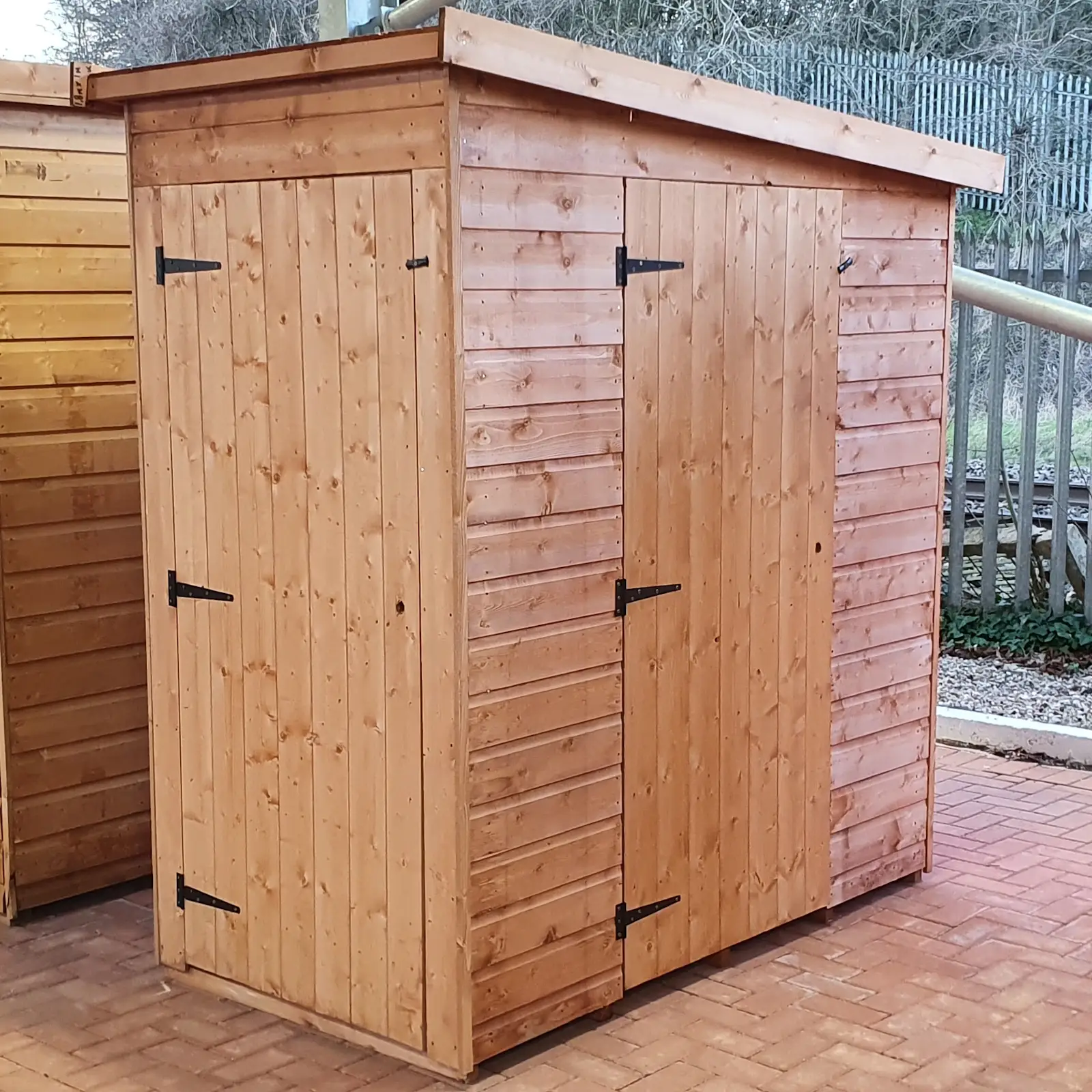 - Pent roof design including a front and side door with a width of 762 inches. Enter the shed from the front and then exit from the side providing easy access.