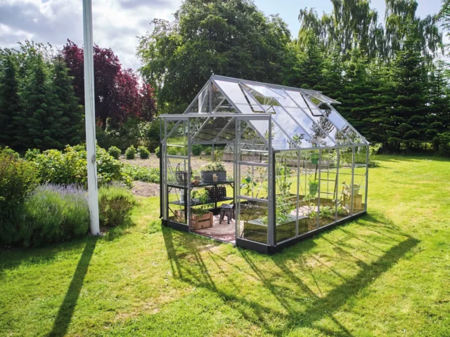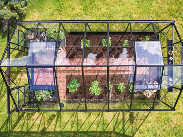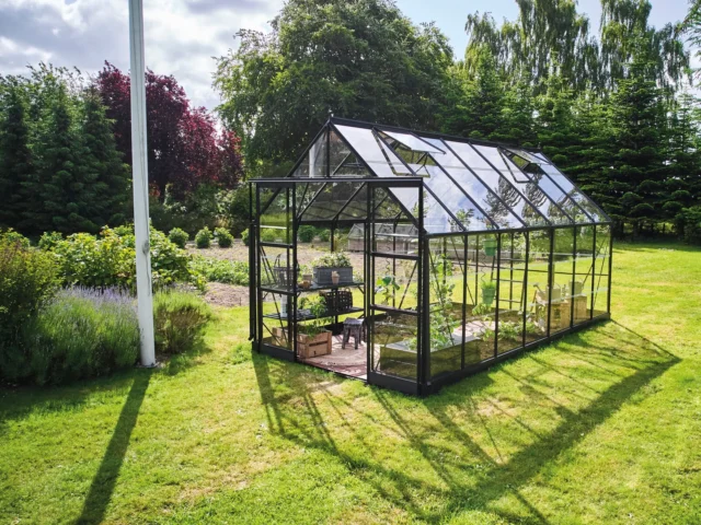 Halls ICON 8 is a freestanding greenhouse that combines classic design with modern features. The eaves height provides better space for taller plants. The low threshold makes access easier — even with planters or tools. The wide double sliding doors create a versatile outdoor space — ideal for growing vegetables, fruit and herbs, or as a retreat in the garden.