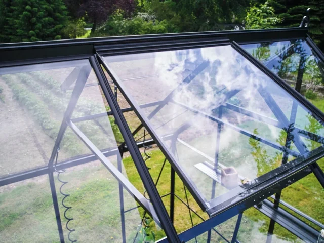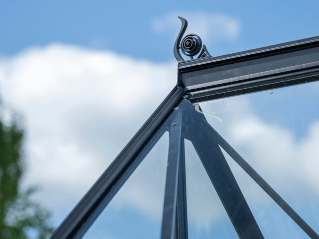 Special details such as the innovative G-clips (standard with toughened glass in long panes and horticultural glass in long panes is supplied with regular glazing clips) ensure secure glazing, while the optimised roof pitch improves the rain clearance capability. The wide gutters for rainwater harvesting — a plus for the environmentally conscious gardener.